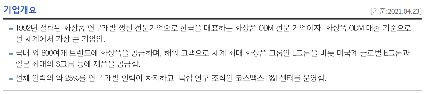코스맥스 차이나와 코스맥스 광저우를 통해 중국시장 화장품 사업을 영위하고 있으며, 중국 내 라이브커머스 확산 트랜드에 따라 중국 내 인플루언서 및 로컬 브랜드와 같은 매출처를 사전에 확보해놓은 기업.