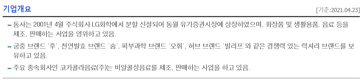 오휘, 숨, 수려한 등 고급 화장품 브랜드를 소유하고 있으며 대부분 판매하는 화장품이 중국인들에게 인기가 많으며, 코로나 이후에는 라이브커머스를 통한 중국 판매 및 유통을 집중하고 있음. 라이브커머스의 가장 큰 시장인 중국에서 라이브커머스를통한 화장품 판매량이 증가할 것으로 기대되는 기업